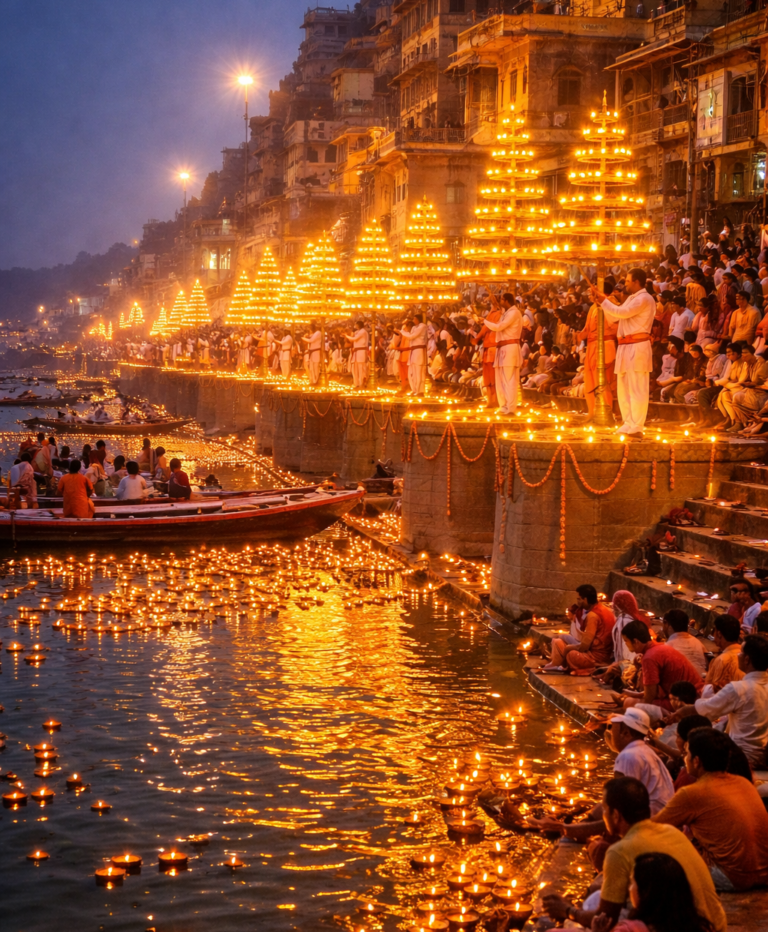 Varanasi is widely celebrated as the City of Festivals, where every occasion is infused with deep spirituality, vibrant culture, and centuries-old traditions that continue to thrive in daily life. Festivals here are not just events—they are grand spiritual expressions that unite faith, devotion, music, rituals, and celebration. During major festivals, the ghats glow with countless oil lamps, the River Ganga reflects shimmering golden lights, temples echo with sacred chants, and the entire city becomes a magnificent stage of devotion. The most enchanting spectacle is Dev Deepawali, when millions of diyas illuminate the ghats, creating a heavenly sight that attracts devotees and travelers from across the world. Diwali, Ganga Mahotsav, and Mahashivratri are celebrated with immense reverence through elaborate rituals, cultural performances, temple processions, devotional music, and fireworks. Festivals like Holi, Buddha Purnima, Nag Nathaiya, Ram Navami, Chhath Puja, and Makar Sankranti highlight the city’s religious diversity and cultural richness. Throughout these celebrations, traditional dance, classical music, local folklore, and community gatherings bring people together in joy and devotion. Even the daily Ganga Aarti at Dashashwamedh and Assi Ghats feels like a festival, with synchronized rituals, glowing lamps, chanting priests, and thousands of devotees witnessing this divine ceremony every evening. Together, these celebrations reflect the timeless spiritual energy, cultural vibrancy, and eternal soul of Varanasi, making it one of the most spiritually alive cities in the world.